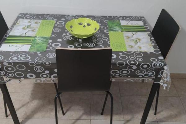 Voll ausgestattete Küche mit Backofen, Kühlschrank, Gefrierschrank, Kochgeschirr, Geschirr und Besteck.