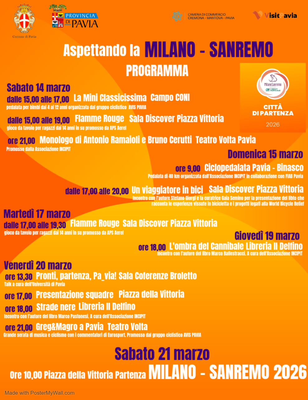 L’attesa in città, dunque, per la Classica di Primavera non si esaurisce sulla linea del via: infatti dal 14 al 21 marzo 2026 Pavia invita cittadini e turisti a "respirare l’energia del grande ciclismo" attraverso un calendario diffuso di iniziative.