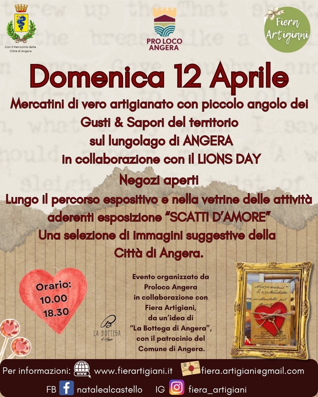 L’iniziativa è organizzata da Proloco Angera in collaborazione con Fiera Artigiani, da un’idea de La Bottega di Angera, con il patrocinio del Comune di Angera.