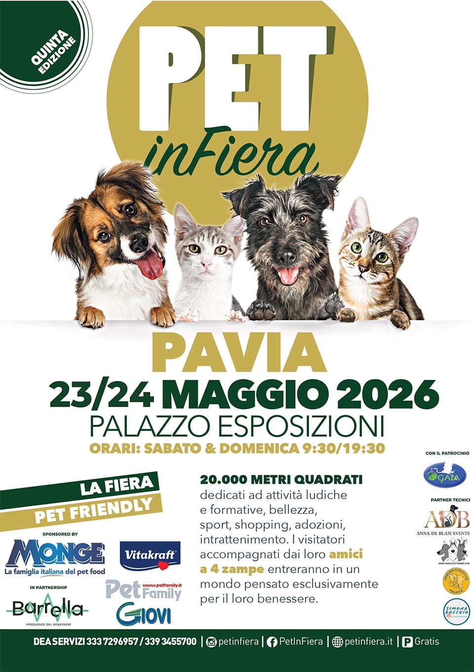 Tutto pronto per la quinta edizione di PET in FIERA, l’evento che celebra il mondo degli animali domestici a 360°. Sabato 23 e domenica 24 maggio 2026, il Palazzo Esposizioni di Pavia aprirà le porte a migliaia di appassionati, famiglie e professionisti per un weekend di incontri, scoperte e divertimento dedicato soprattutto a cani e gatti, ma aperto a tutto l’universo pet.