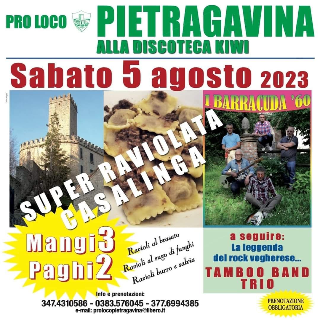 A grande richiesta, il tradizionale appuntamento di Pietragavina di Varzi, con cena a base di Ravioli al brasato fatti a mano dai migliori cuochi della Proloco!