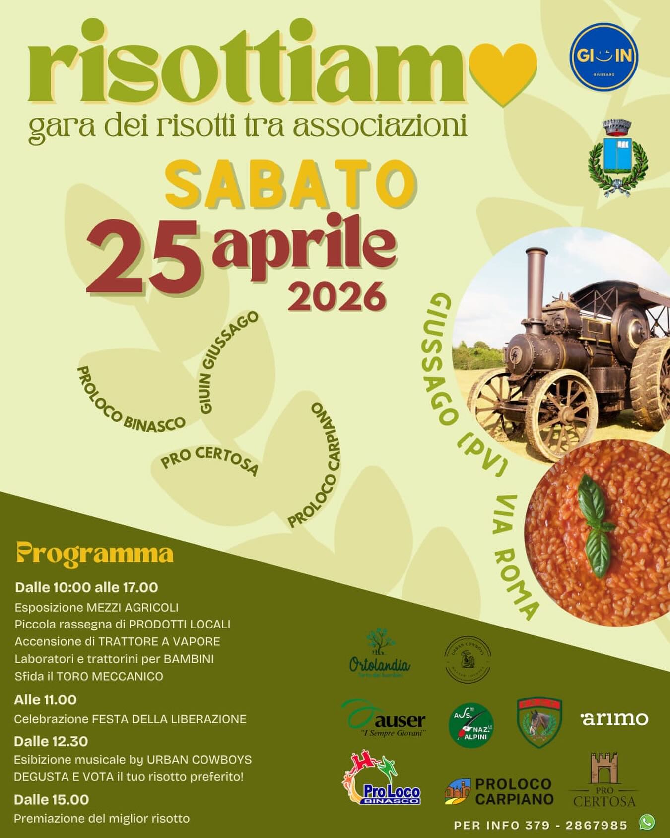 Sabato 25 aprile 2026, in occasione della Festa della Liberazione, Giussago si trasforma nel cuore pulsante della tradizione risicola lombarda. Torna "Risottiamo", la gara dei risotti tra associazioni che ogni anno richiama appassionati, curiosi e buongustai da tutto il territorio della provincia di Pavia e non solo.