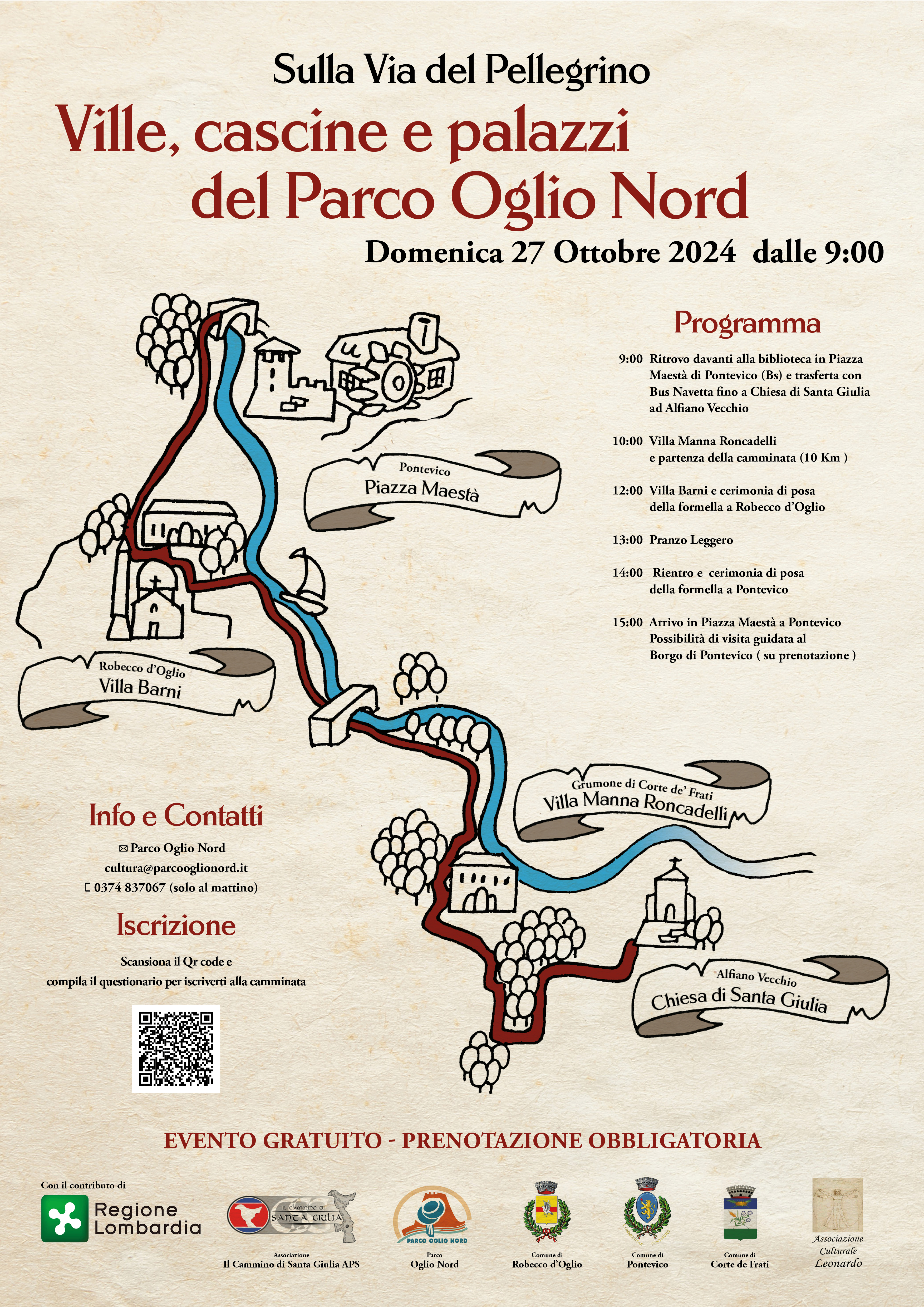 Ritrovo presso la biblioteca comunale di Pontevico (Piazza Maestà) alle 9:00 e trasferimento con bus navetta alla chiesa di Santa Giulia di Alfiano Vecchio e da qui alla Villa Manna Roncadelli di Grumone; da qui una camminata collettiva lungo il fiume Oglio per apprezzare gli ambienti ripariali tutelati del Parco Oglio Nord.