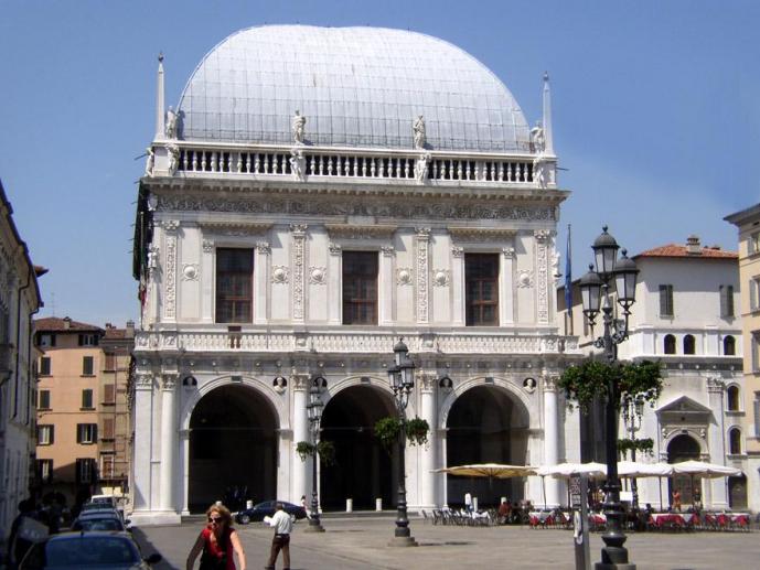 lun, 15/07/2013 - 11:42 -- Laura Itinerario: Le Haut Moyen-Age et le Romain-gothique Les grandes places du centre Tipologia: Palais Tag: Palazzo del Broletto Le palais, centre du gouvernement de la Commune et de la Seigneurie, est le résultat architectural de l’addition des différentes interventions qui se sont succédées pendant presque un siècle. Il s’étend sur un plan complexe autour de plusieurs cours intérieures dans un espace total inscriptible dans un quadrilatère d’environ 100m sur 75. L’aile sud, orientée vers la via Cardinal Querini, fait face au flanc gauche du Dôme et correspond à l’ancien « Palatium Novum Maius » (1223-1227) qui fut largement modifié, particulièrement au XVIIème siècle. Cette partie, ainsi que l’aile est, se caractérisent par une maçonnerie massive, à la différence du flanc ouest, achevé à la fin du XIIIème siècle avec des briques. A l’extérieur, depuis la via Cardinal Querini, on remarque immédiatement la tour des Poncarali, intégrée dans le périmètre sud au cours de travaux de construction du palais mais qui se distingue néanmoins de ce dernier par le bossage rustique qui la caractérise. Haute à l’origine d’une trentaine de mètres, elle fut écimée en 1258 sur ordre d’Ezzelino da Romano et réduite à environ 19 mètres. En revanche, la torre del Pègol ou torre del popolo sur laquelle s’adossait la première construction du palais communal (1187) en grande partie en bois, est entière : haute d’environ 54m, elle est pourvue à son sommet d’une petite chambre qui abrite la cloche. Celle-ci recouverte de briques est dissimulée derrière des créneaux gibelins ajoutés dans les premières années du XIXème siècle ; sur le côté interne de la première cour du Broletto se trouve l’horloge provenant de la cathédrale de San Pietro de Dom, tout proche, détruite à la fin du XVIème siècle. A côté de la cour et donnant sur la Place Paolo VI, on remarque le balcon dit « Loggia delle Grida » (qui fut détruite par les Jacobins en 1797 et reconstruite au début du XXème siècle) et, à gauche du portail, donnant sur la ruelle du même nom, la façade en brique de l’église de Sant’Agostino qui date des premières décennies du XVème siècle. Elle fut intégrée au Broletto au XVIème siècle et complètement transformée à l’intérieur jusqu'à ce qu’en 1803, l’abside laisse la place à l’escalier du Pollack. On accède au Broletto par la porte ouest de 1606, encadré par des colonnes monolithiques d’époque romaine en granit d’Egypte, qui sont aussi d’anciens éléments ornementaux de la cathédrale aujourd’hui détruite de Saint Pier de Dom. La partie supérieure de la porte a été conçue par Tagliaferri à la fin du XIXème siècle. Dans le passage qui relie la porte cochère à la cour, la pierre mutilée par les Jacobins située sous la sculpture de la Justice en majesté, représentait le lion de San Marco. Sur la droite, on distingue encore une fresque du XIIIème siècle représentant une Vierge à l’Enfant en majesté. C’est dans la grande cour sud ornée en son centre d’une fontaine du XVIIIème siècle, que donnent, à l’ouest et au sud, les plus anciennes ailes du palazzo nuovo maggiore où s’ouvraient des porches aujourd’hui murés ; particulièrement précieux, les chapiteaux des fenêtres du premier étage représentant douze figurations des mois, et plus spécialement ceux de la fenêtre bigéminée de gauche qui présente dans la lunette un oculus lobé. Il convient également de noter la reconstitution de l’ancien escalier de bois qui permettait, au Moyen-Âge, d’accéder à la grande salle du « Maggior Consiglio » au premier étage. Le flanc est est occupé par le palazzo nuovo minore ainsi nommé parce qu’il fut achevé après le premier édifice du côté Ouest (1232). Au cours des vingt premières années du XVème siècle, il fut enrichi de la loggia malatestiana : quatre arcs raffinés à l’ogive discrète, voûtes d’arêtes et voûtes en croisée d’ogive. C’est encore Pandolfo Malatesta qui commanda les fresques de Gentile da Fabriano desquelles on a retrouvé récemment quelques fragments. D’autres fresques de Lattanzio Gambara qui décoraient la loggia furent malheureusement détruites par le bombardement qui frappa le Broletto et la place Paolo VI le 13 juillet 1944. La base des colonnes mises à jour il y a peu témoignent du niveau du terrain à l’époque, bien inférieur à l’actuel. Sur le côté Nord de la cour se dresse une construction de 1626 sur un portique de style classique à bossage, avec des mascarons dans les clefs de voûtes et une galerie. La porte Est (1610) est parfaitement alignée sur le tracé de l’antique decumanus et se trouve dans le prolongement exact de la porte qui, ouverte sur le flanc Ouest, donne sur la place Paolo VI. Quelques mètres après être entré, avant la seconde porte (1626) qui débouche sur la cour, on trouve sur la gauche l’escalier d’honneur del Lezze (1610) qui mène aux bureaux de l’Etat Civil. Laissant derrière soi l’escalier et le corridor aux plafonds décorés par Tommaso Sandrini et Francesco Giugno (1574-1651), on entre dans la salle du Podestà qui est en réalité une seule et immense pièce de 52m sur 15, subdivisée en quatre pièces différentes dans les années 1600. La hauteur de la salle d’origine (9m) a elle aussi été réduite et chacune des quatre pièces actuelles possède une voûte ornée de fresques : La Force retenant la Fortune et La Vertu dans les nues exhortant le monde d’Antonio Gandino, L’Abondance dans la deuxième salle, toujours de Gandino, et dans les deux pièces suivantes, des fresques de Tommaso Sandrini : L’allegorie du Temps dans la troisième et des figures féminines représentant des allégories dans la quatrième. Dans le vide laissé entre les plafonds des salles de l’Etat Civil et le toit à chevro