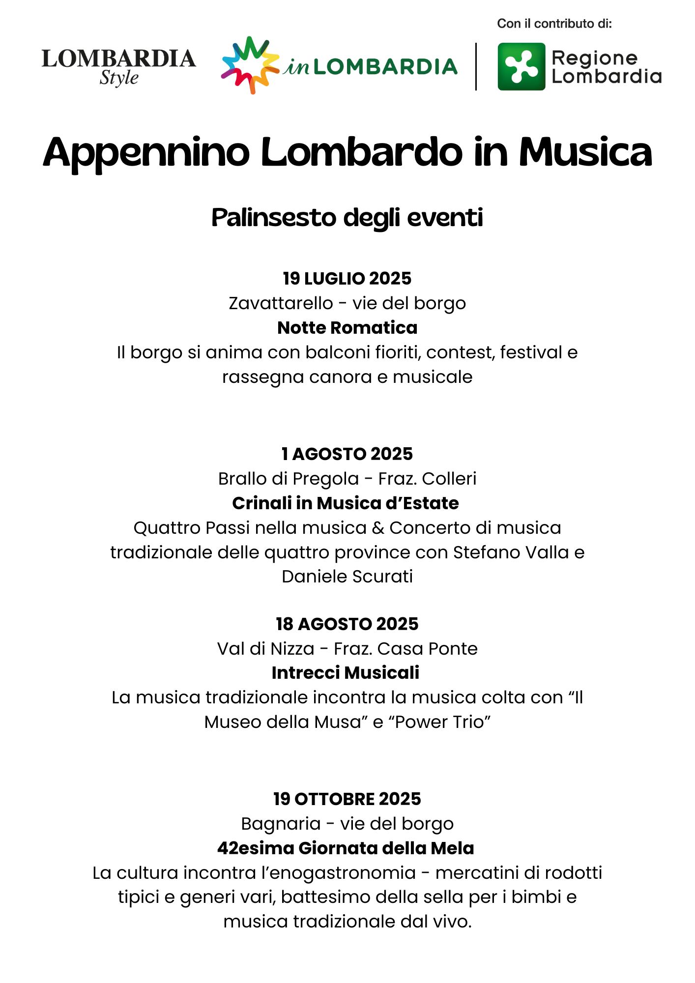 Grazie al contributo di Regione Lombardia con il bando "Lombardia Style", i comuni di Brallo di Pregola, Bagnaria, Val di Nizza e Zavattarello con la collaborazione delle associazioni locali, hanno organizzato un ciclo di eventi partiti a luglio e che proseguono fino ad ottobre.