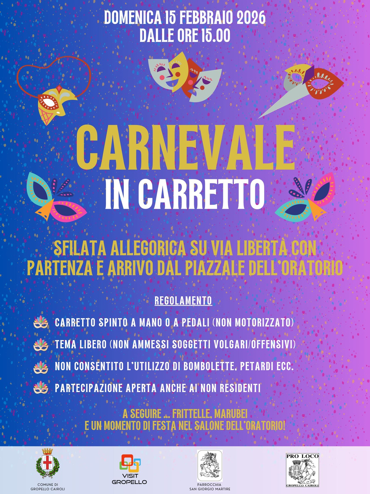 Ritrovo alle ore 15.00 presso il piazzale dell'oratorio parrocchiale. Al termine della sfilata, un momento di festa nel salone dell'oratorio.