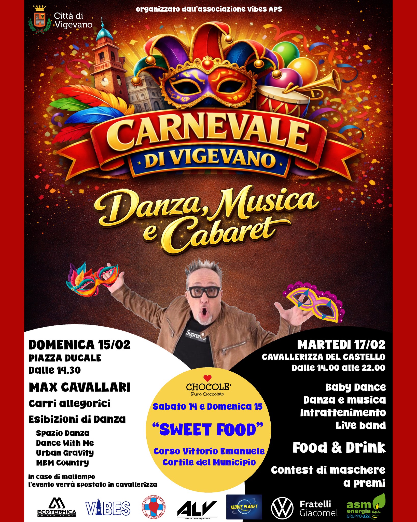 Vigevano si prepara ad accendere il Carnevale con un ricco programma di eventi pensato per tutte le età. Sabato 14 e domenica 15 febbraio Corso Vittorio Emanuele II e il cortile del Municipio diventano protagonisti di momenti di festa, dolcezza e divertimento grazie alla presenza di Sweet Food con Chocolè Puro Cioccolato. Un’occasione per gustare prelibatezze di cioccolato e vivere l’atmosfera carnevalesca passeggiando tra le vie storiche della città.