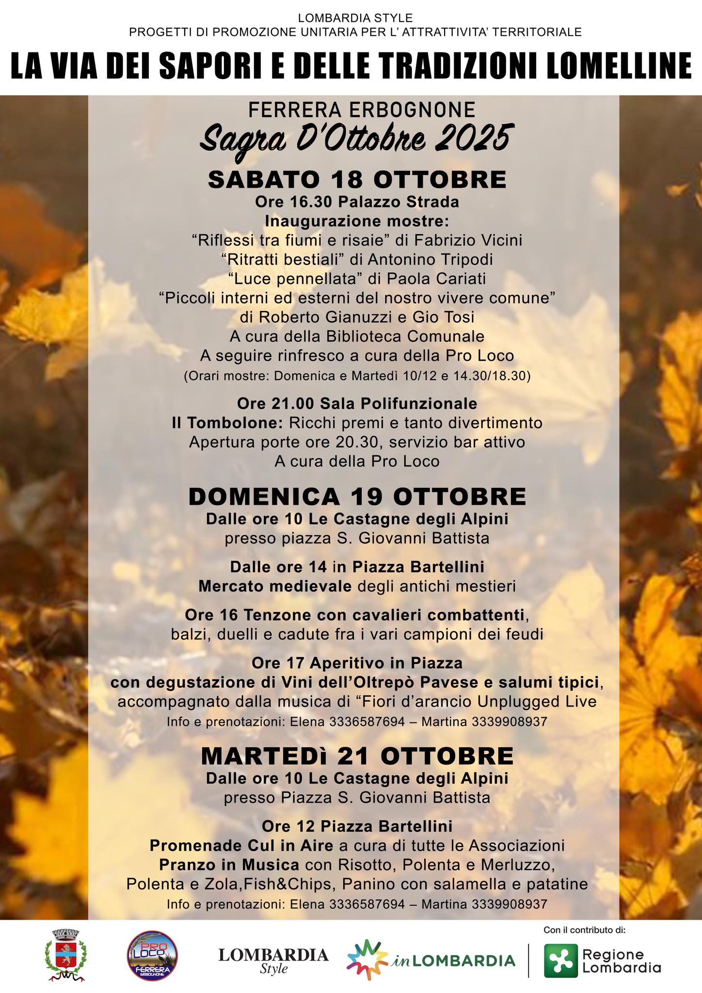 Il programma prenderà il via sabato 18 ottobre alle ore 16.30 presso Palazzo Strada con l’inaugurazione delle mostre “Riflessi tra fiumi e risaie” di Fabrizio Vicini, “Ritratti bestiali” di Antonino Tripodi, “Luce pennellata” di Paola Cariati e “Piccoli interni ed esterni del nostro vivere comune” di Roberto Gianuzzi e Gio Tosi, a cura della Biblioteca Comunale. Seguirà un rinfresco a base di prodotti del territorio a cura della Pro Loco. La serata proseguirà alle ore 21 nella Sala Polifunzionale con il tradizionale Tombolone.