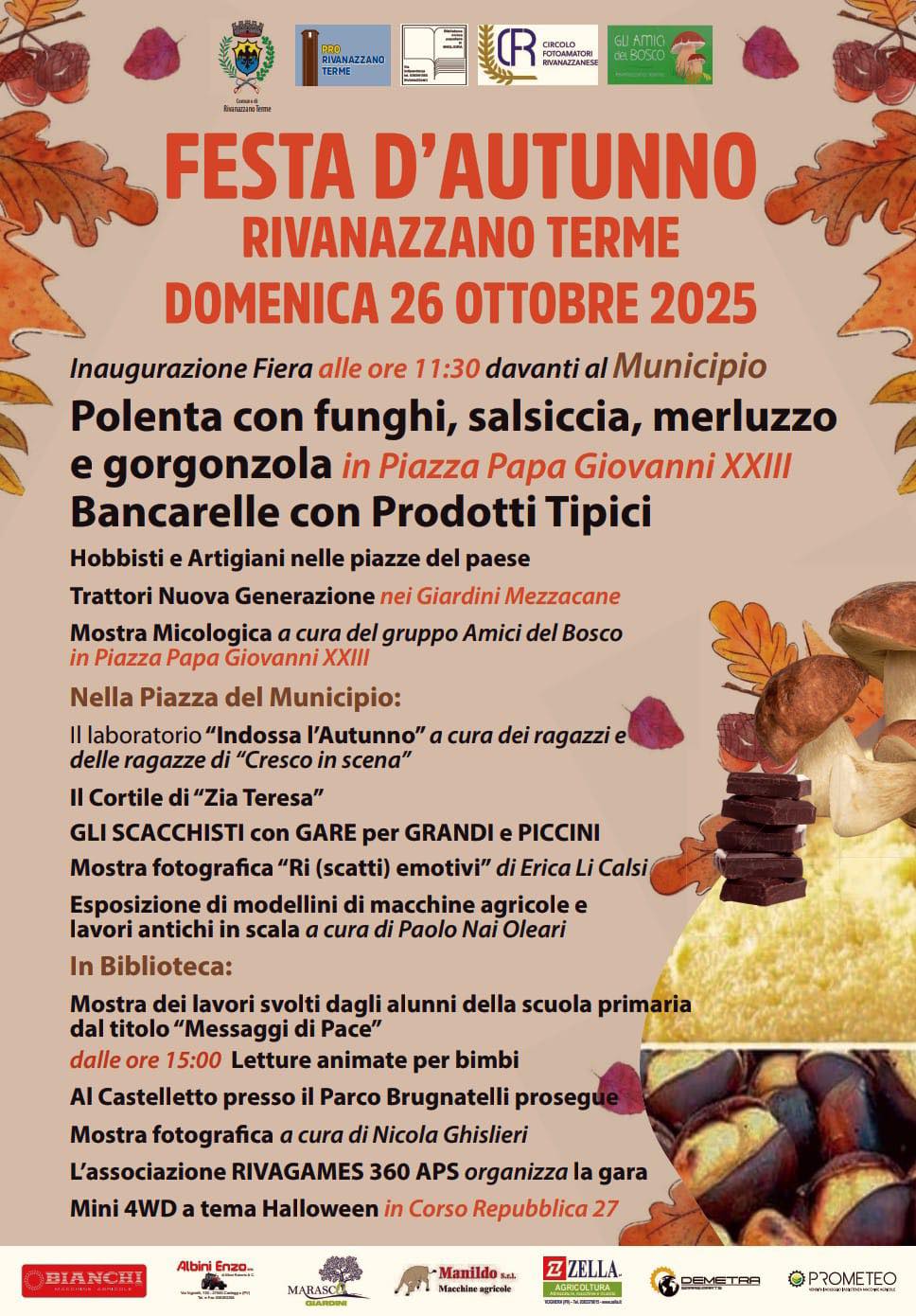 Mostra Micologica e Laboratori: Presso le aree espositive si potrà visitare la Mostra Micologica curata dal gruppo Amici del Bosco, perfetta per appassionati e curiosi del mondo fungino. Nella Piazza del Municipio, il laboratorio "Indossa l'Autunno", curato dai ragazzi e dalle ragazze di "Cresco in scena", coinvolgerà i più giovani in attività creative a tema.