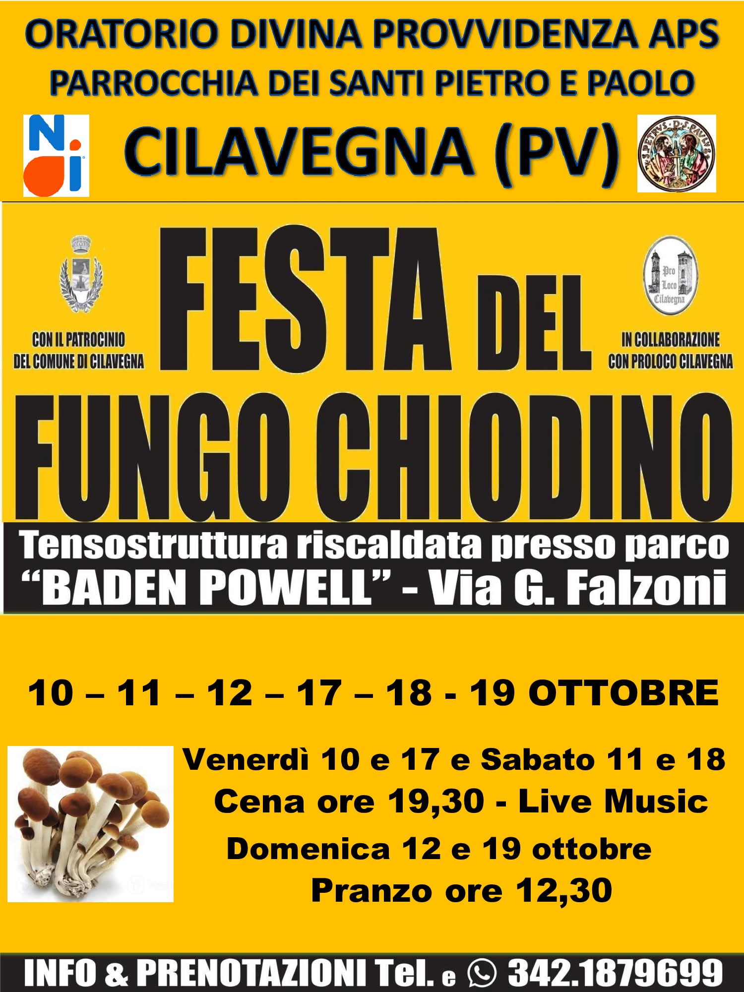 La tradizionale sagra autunnale si svolgerà anche quest’anno presso la tensostruttura riscaldata del parco Baden Powell (via G. Falzoni), organizzata dall’Oratorio Divina Provvidenza di Cilavegna, in collaborazione con la parrocchia dei Santi Pietro e Paolo e la Pro Loco di Cilavegna, con il patrocinio del Comune.