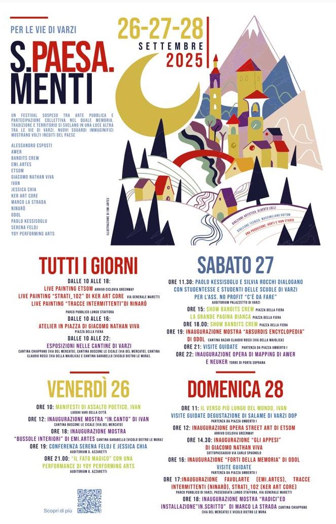 Dal 26 al 28 settembre 2025 torna a Varzi S.Paesa.Menti, il festival che unisce arte contemporanea, performance e creatività diffusa nel cuore dell’Oltrepò Pavese. Per tre giorni, le vie e le piazze del borgo medievale si trasformeranno in un museo a cielo aperto, con installazioni, mostre, laboratori ed eventi che coinvolgeranno artisti, studenti e visitatori.