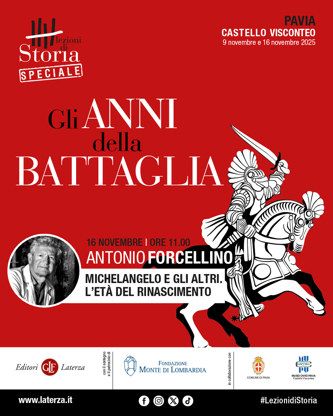 L’incontro, dal titolo “Gli anni della battaglia: Michelangelo e gli altri. Gli anni del Rinascimento”, rientra nel ciclo Lezioni di Storia, un progetto promosso da Editori Laterza, con il sostegno e il patrocinio della Fondazione Monte di Lombardia e in collaborazione con il Comune di Pavia e i Musei Civici di Pavia.