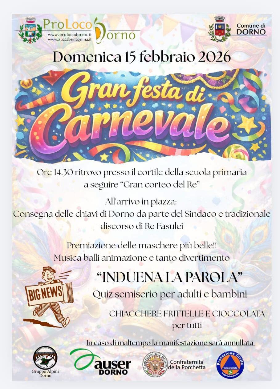 Durante la manifestazione, cioccolata calda, frittelle e chiacchiere a cura delle associazioni dornesi per un Carnevale dolcissimo!