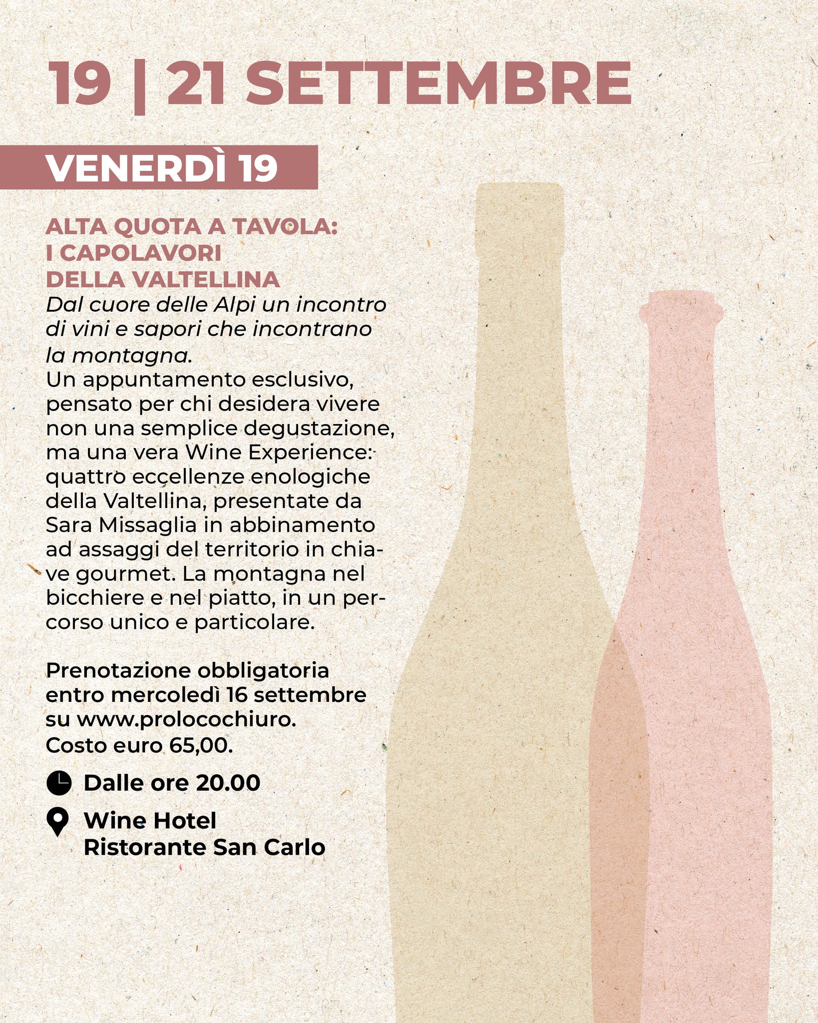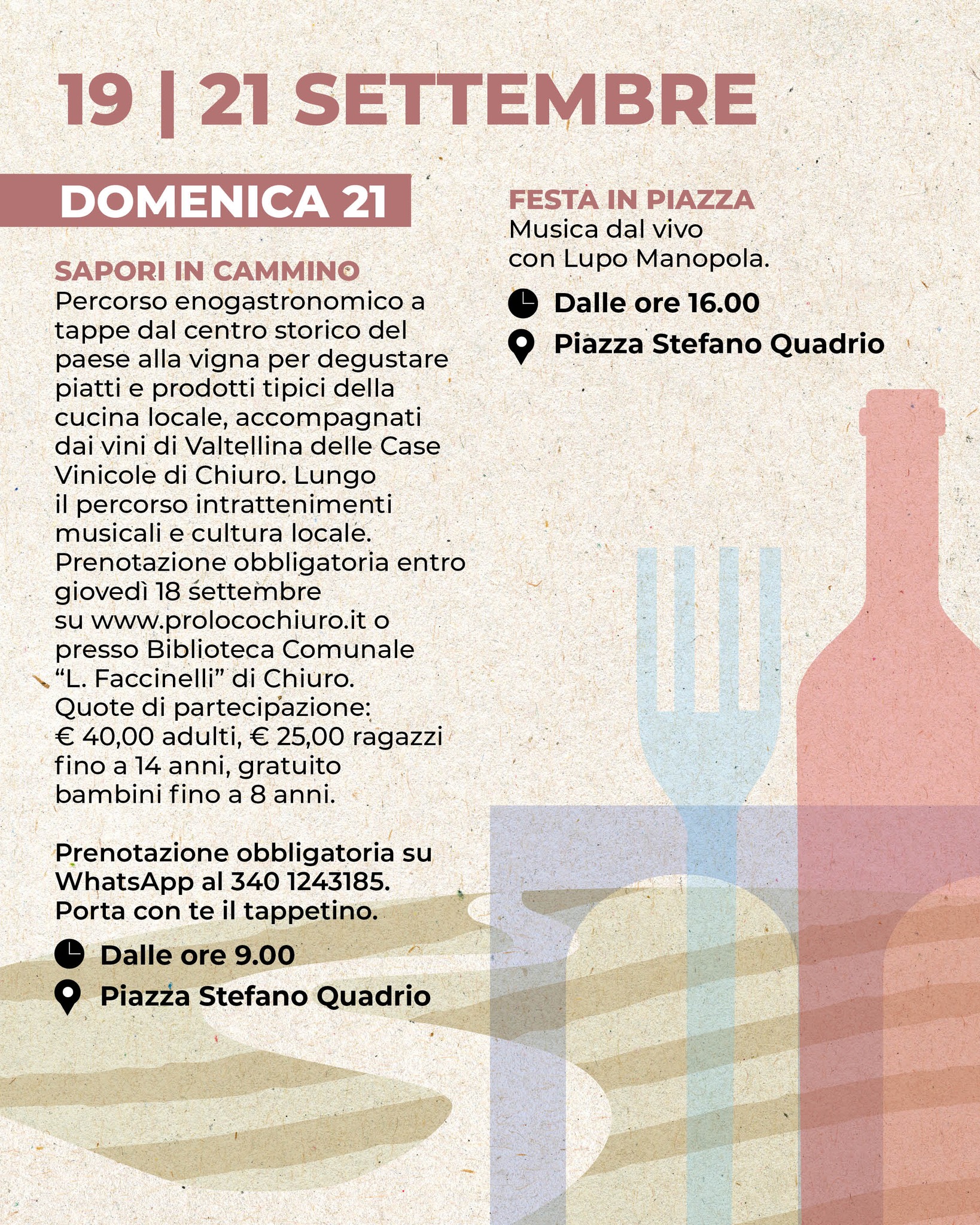 Cinque isole del gusto nel cuore del borgo: degustazioni di vini (Bollicine, Bianchi e Rosé, Rosso di Valtellina, Valtellina Superiore DOCG e Valtellina Superiore DOCG Riserva, Sforzato di Valtellina), con la partecipazione della giornalista e wine educator Sara Missaglia, delegazioni AIS e ONAV di Sondrio. Giochi sensoriali e mercatini. Musica tra le corti, vino tra le mani: la fisarmonica di Germano Melotti, le sonorità live del gruppo DeBeat e alle 21.00 tutti in piazza per il concerto del gruppo Rokita!