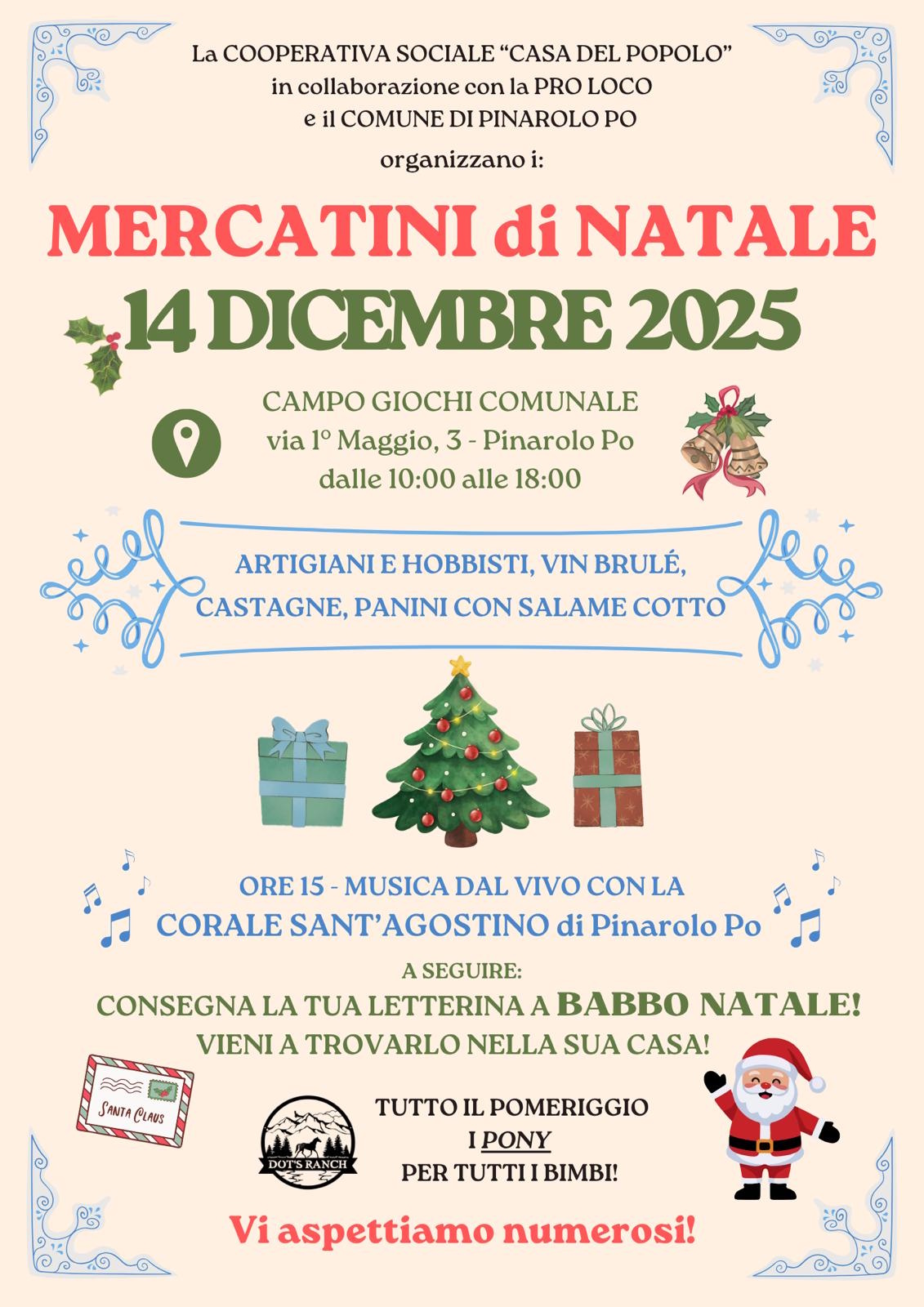La Cooperativa Sociale Casa del Popolo in collaborazione con la Pro-Loco e il Comune di Pinarolo Po organizza Domenica 14 Dicembre 2025 dalle ore 10:00 alle ore 18:00 presso il campo Giochi Comunale i MERCATINI DI NATALE!