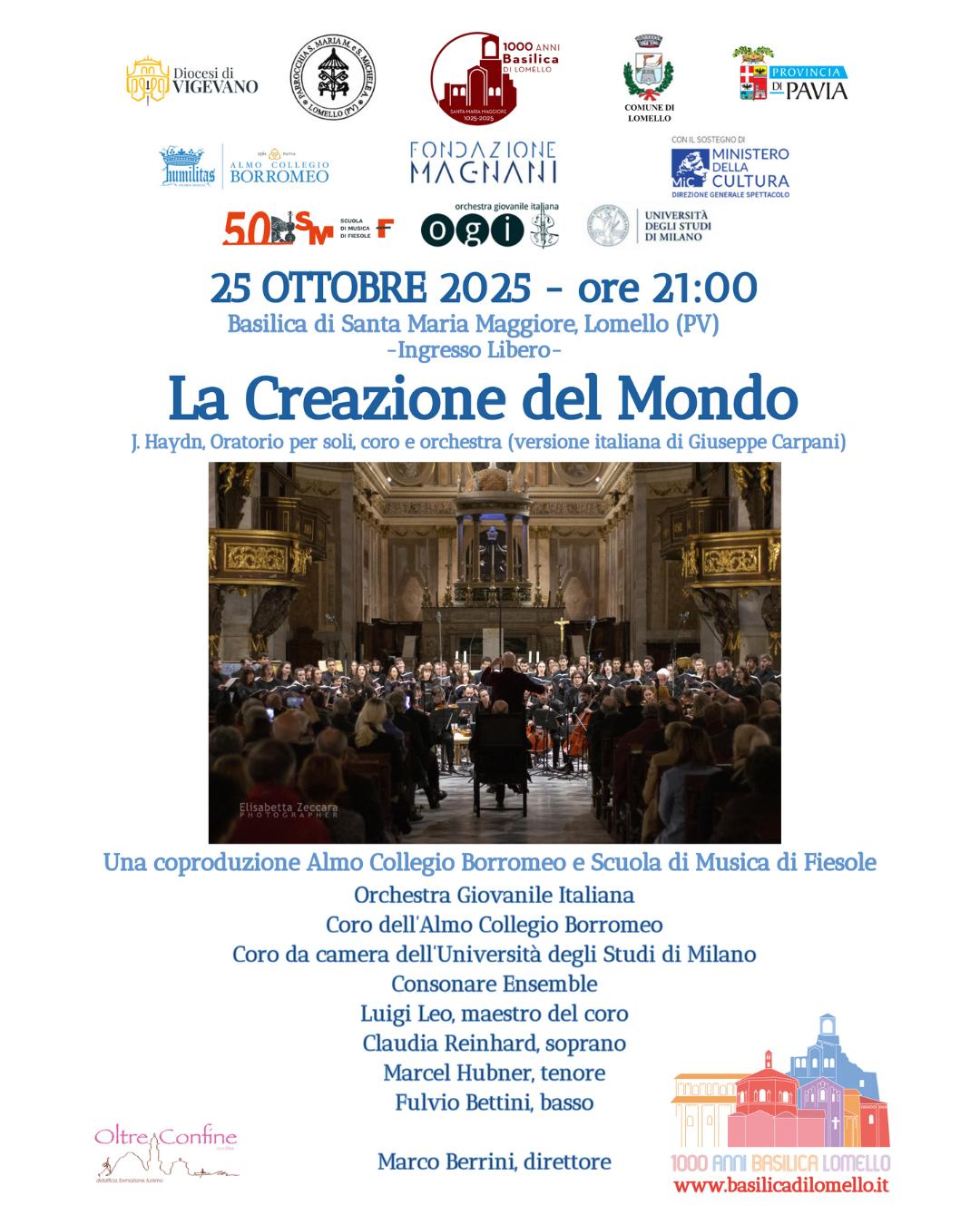 Nel contesto delle celebrazioni per il Millenario di Lomello, sabato 25 ottobre 2025 alle ore 21.00, presso la Basilica di Santa Maria Maggiore, sarà eseguita La Creazione del Mondo di Joseph Haydn, nella versione italiana di Giuseppe Carpani.