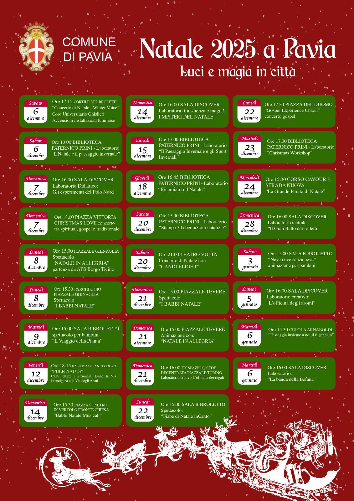Un calendario pensato per offrire a cittadini e visitatori molte occasioni per passeggiare tra le luci del centro, scoprire le eccellenze locali e respirare l’atmosfera natalizia di Pavia.
