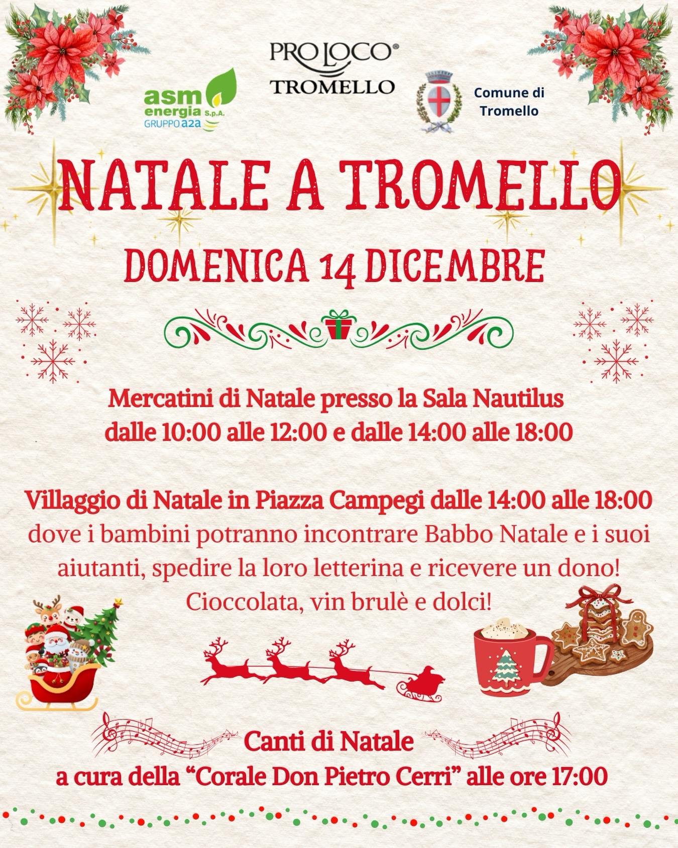 Domenica 14 dicembre 2025 Tromello si veste di magia per una giornata interamente dedicata allo spirito natalizio. Il paese ospita un ricco programma di eventi pensati per grandi e piccoli, tra mercatini, intrattenimenti e atmosfere suggestive nel cuore della Lomellina.
