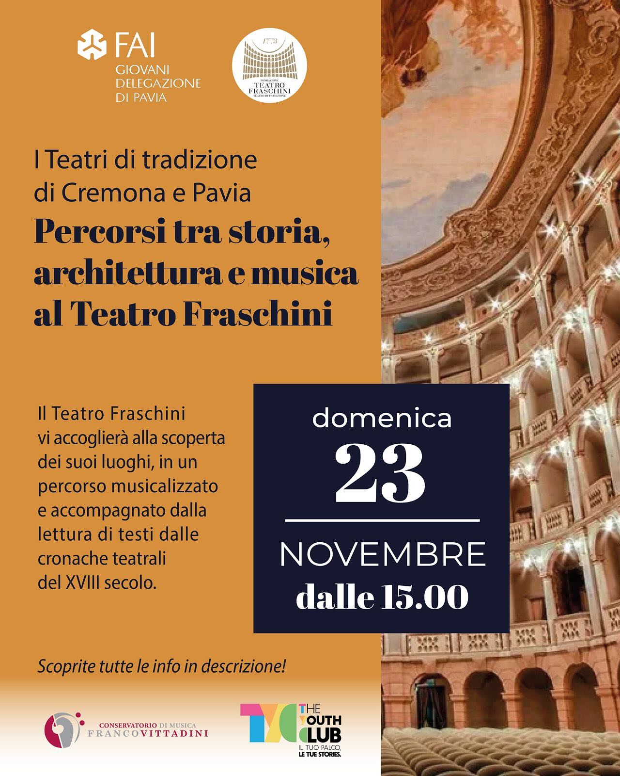 Il Teatro Fraschini di Pavia apre le sue porte per un’esperienza unica e coinvolgente. Domenica 23 novembre 2025, alle ore 15.00, il gruppo FAI Giovani Pavia, in collaborazione con il Conservatorio Vittadini, invita cittadini e visitatori a scoprire il celebre teatro pavese “come non lo hai mai visto”.