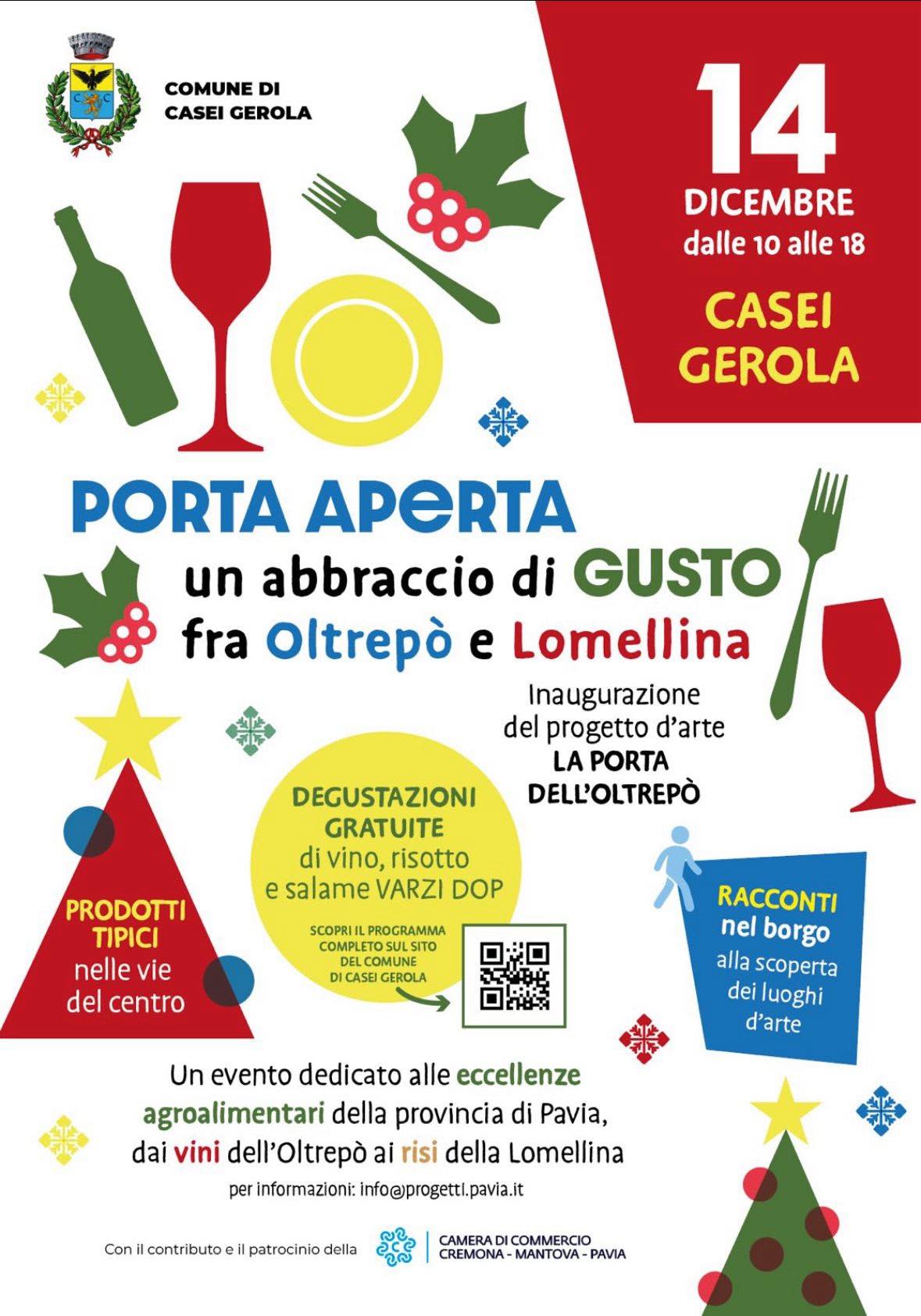 Il Comune di Casei Gerola presenta, sabato 14 dicembre, dalle 10.00 alle 18.00, l’evento “Porta Aperta – Un abbraccio di gusto fra Oltrepò e Lomellina”, una giornata dedicata alla valorizzazione delle eccellenze agroalimentari della provincia di Pavia. L’iniziativa nasce per celebrare l’incontro fra due territori ricchi di tradizioni: i vini dell’Oltrepò Pavese e i risi della Lomellina.