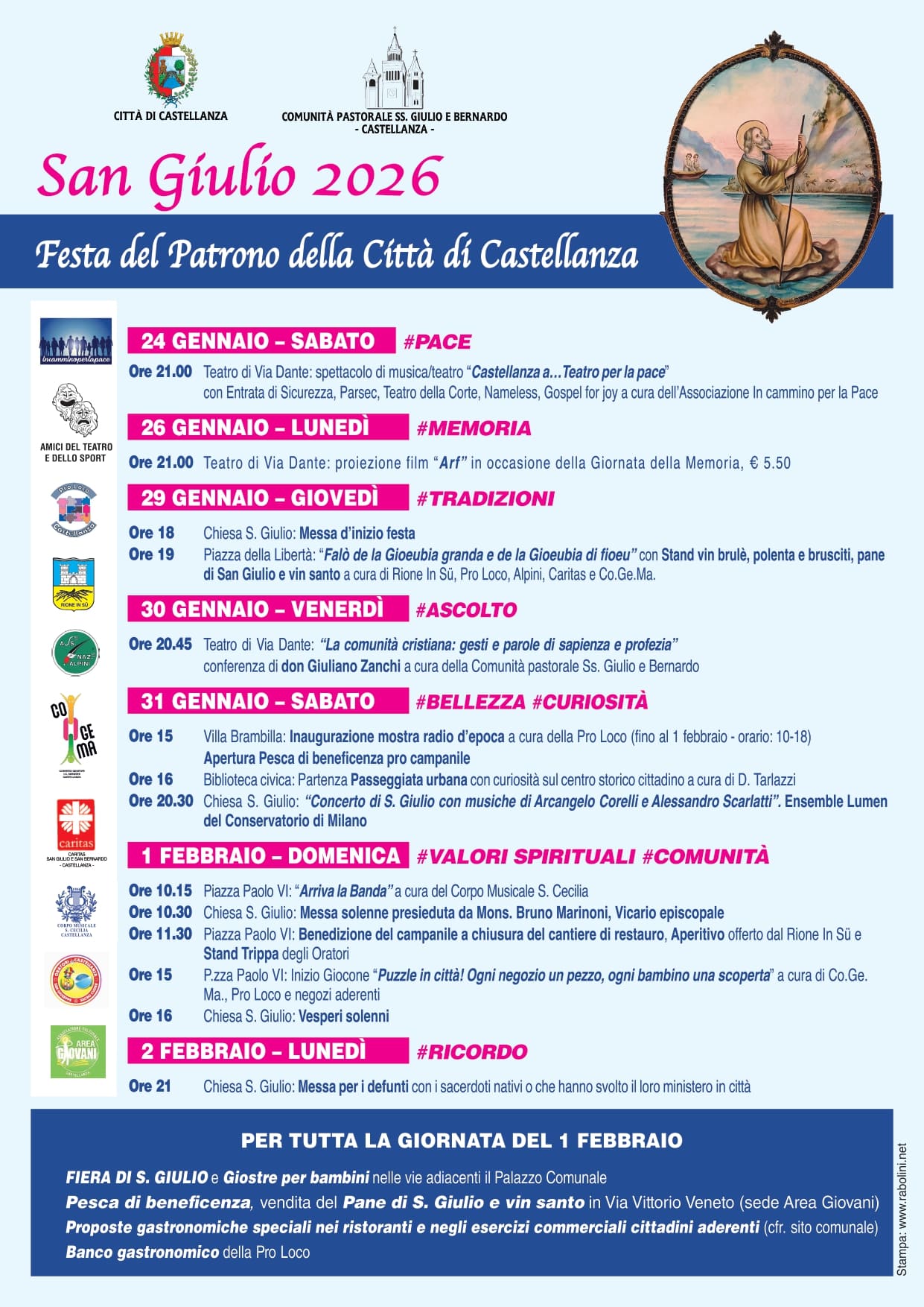 Castellanza si prepara a celebrare San Giulio, patrono cittadino, con la tradizionale festa che, quest’anno, si svilupperà attraverso un articolato calendario di eventi distribuiti su dieci giorni, dal 24 gennaio al 2 febbraio. Un'edizione declinata sulle tematiche della pace, della tradizione, dell'ascolto, della bellezza e delle curiosità e dei valori per una festa che, ogni anno, è capace di riunire tutti i castellanzesi attorno al proprio sentirsi comunità. Un programma che intreccia valori spirituali, memoria storica e tradizioni popolari, coinvolgendo l'intera comunità attraverso oltre 15 appuntamenti organizzati in collaborazione con le associazioni del territorio.