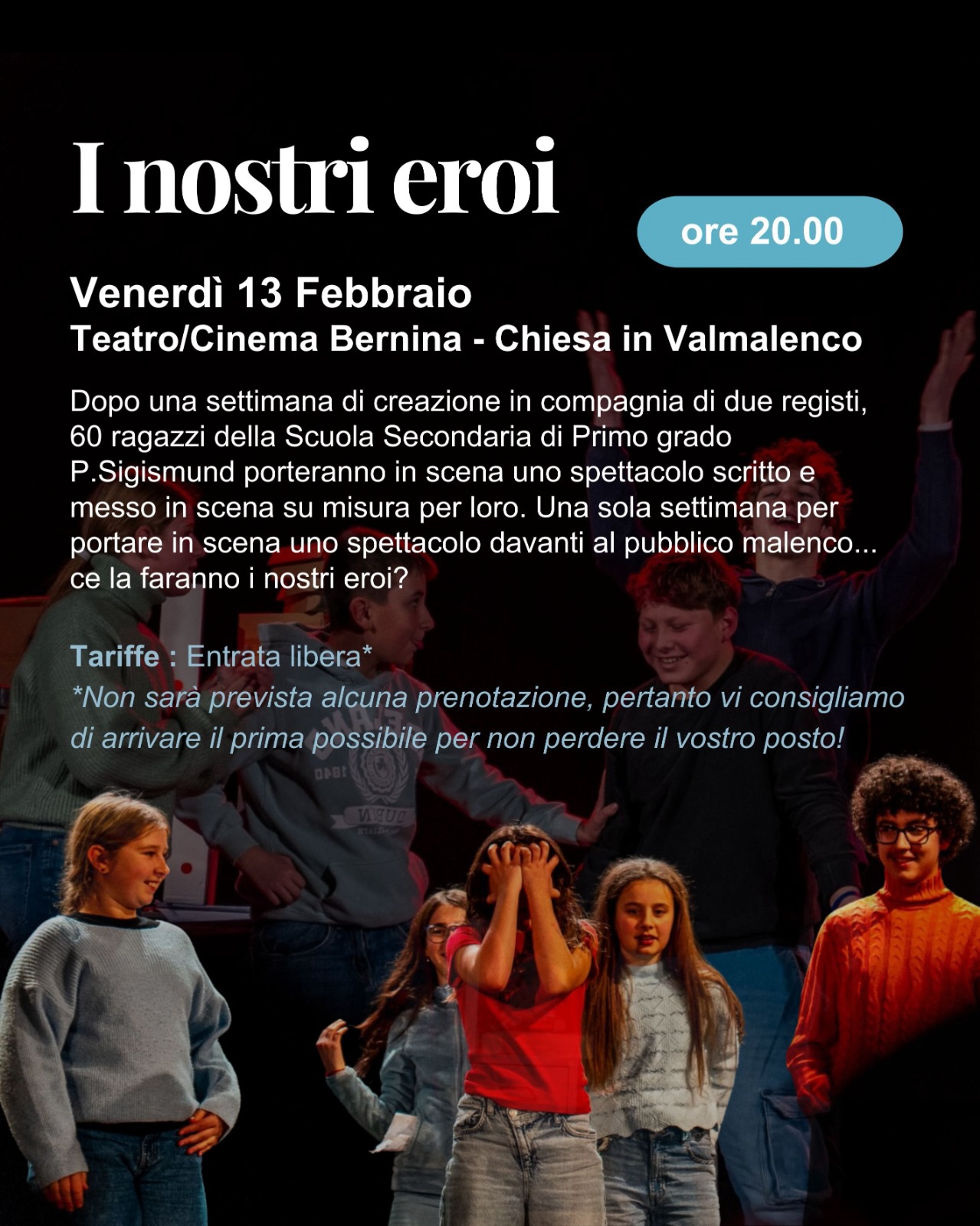 Dopo una settimana di creazione teatrale, 60 ragazzi della Scuola Secondaria di Primo Grado P. Sigismund porteranno in scena uno spettacolo aperto a tutti.