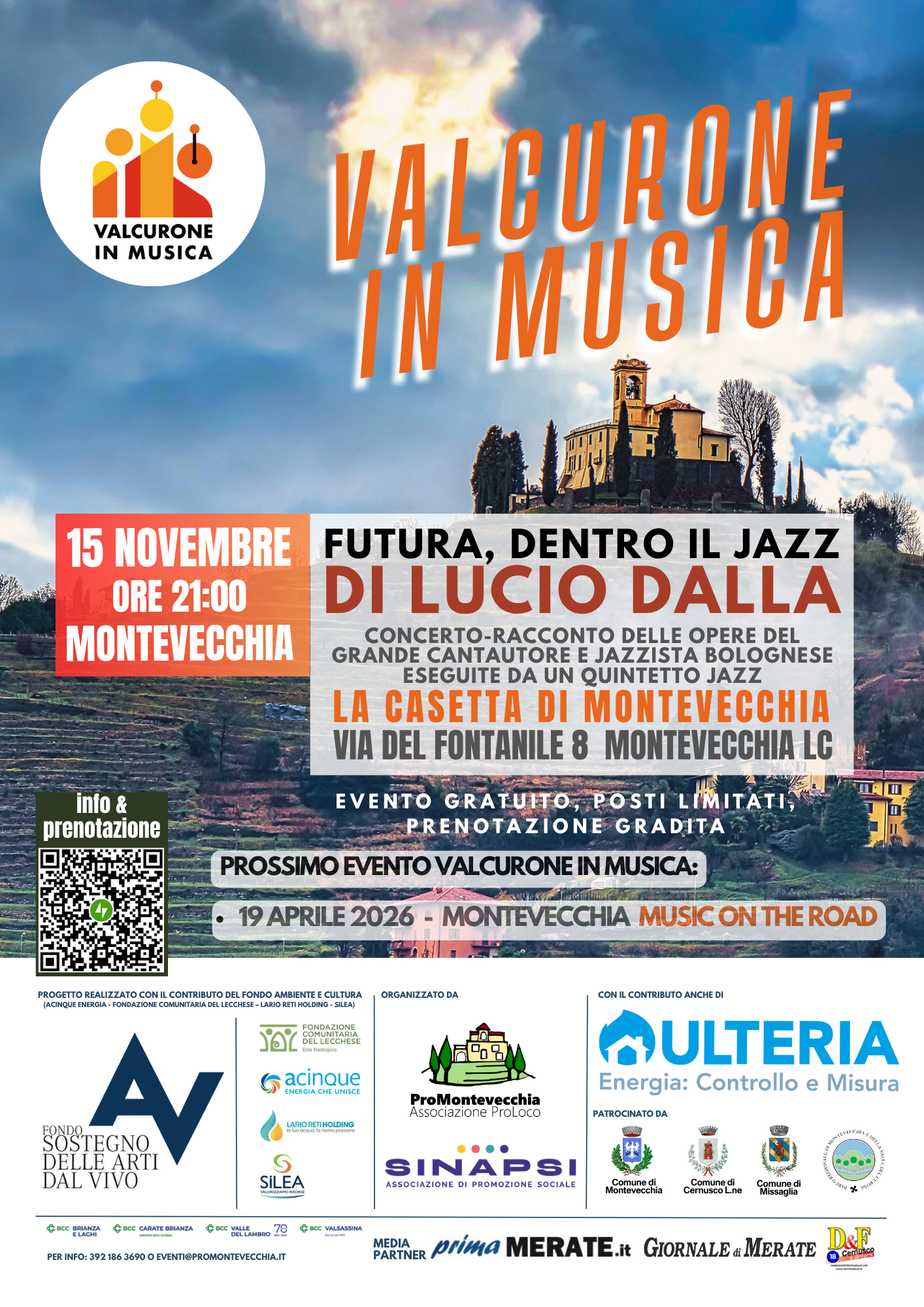 Il prossimo appuntamento in calendario è un evento di grande spessore artistico: il concerto-racconto“FUTURA, DENTRO IL JAZZ DI LUCIO DALLA”, in programma presso la Casetta BIS di Montevecchia, in Via del Fontanile 8, il 15 Novembre alle ore 21:00.