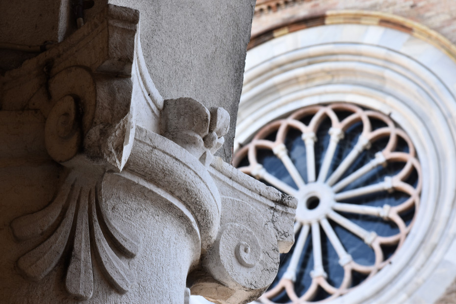Sopra il portale, tra le due bifore, un bellissimo rosone in marmo raffigura una rosa con sedici petali intrecciati, sorretti da sedici colonnine, simbolo del Paradiso.