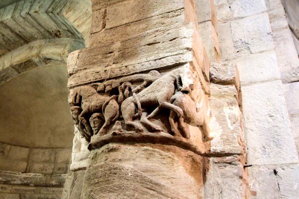 Nella parte absidale sono presenti capitelli decorati con vari motivi, tra cui spicca una scena nota come “La contesa dell’anima”. Raffigura l’anima del giusto strappata al demonio da figure angeliche, un tema iconografico tipico dell’arte religiosa per simboleggiare la lotta tra il bene e il male e l’aspirazione dell’anima verso la salvezza.